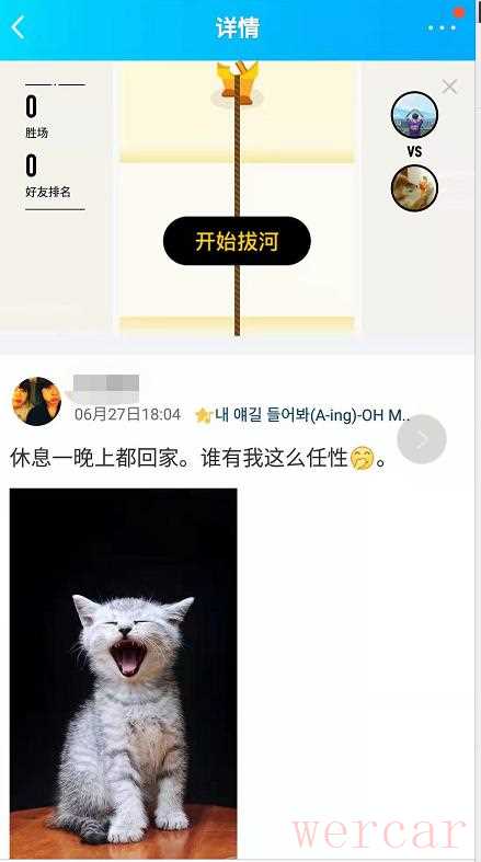 在别人的“说说”里拖动屏幕往下拉,会触发一个“拔河小游戏”。