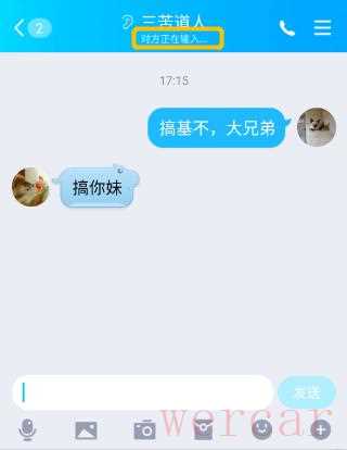 在和好友聊天时,只要对方正在打字,屏幕最上方便会显示“对方正在输入”的提示。