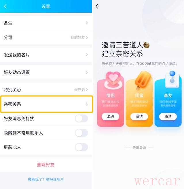 打开“好友设置界面”即能看到“亲密关系”功能,可以跟对方建立三种关系:情侣、闺蜜、基友。