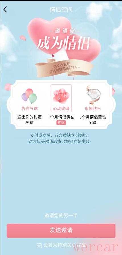 如果选择“情侣关系”,还能给对方赠送高贵的“情侣黄钻”。