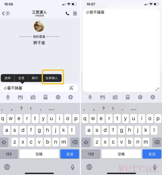 在聊天窗口里长按输入框,就能看到“全屏输入”功能,点它一下立马进入全屏输入模式。