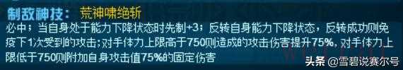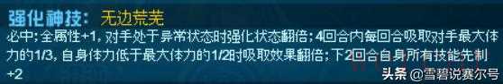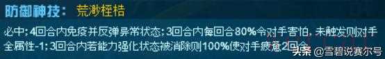 弹控技能,配合魂印先一弹控,有效对抗常规控狗,三回合概率害怕如果刷高体配合魂印可达成无限控,配合减属性补偿也是打输出的手段,而被消强疲惫由于没与强化绑定,导致操作性不高。
