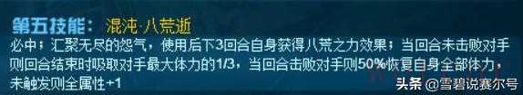 第五技能,触发三回合八荒buff,这加强了辛的一波输出,配合大招打出高额红伤。未击败对手吸血又加强了辛的续航与粉伤。击败对手概率回血,未触发加属性,这就算是锦上添花了,想触发一般用这一招打击四倍克制系,打其他系尽量不要依靠纯第五输出。