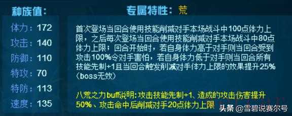 先说一下八荒buff这个机制,这是辛除魂印外另一个较稳定的削体,虽说一次只有20,但胜过没有,此外也是加强辛输出的重要手段,缺点也极度明显,这是一个可以被断回合的buff,面对先三断回合控制会被坑到。