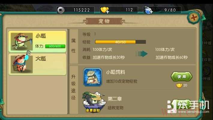 过关组队副本拯救宠物就可能掉落宠物小瓜。有小呱后点它会帮忙加速种子的收获。消耗体力可以帮助宠物成长,升级宠物可以减少工作的体力消耗,宠物体力不够的时候玩家的好友就可以帮你按摩宠物恢复体力了,而且好友还能获得友情值。打组队副本通关第5关时还可以获得宠物饲料,有饲料还可以使用增加宠物经验。大呱在组队副本晶莹露珠掉落。