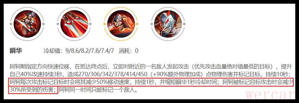 阿轲单挑一个最大的前提,那就是2技能可以命中目标,大家只知道阿轲的2技能有位移,但并不清楚这个标记的作用,10秒钟的施加内,阿轲每次攻击目标都能减速50%持续一秒,且减少2技能的一秒冷却,同时被标记的目标攻击阿轲会减少30%的伤害。
