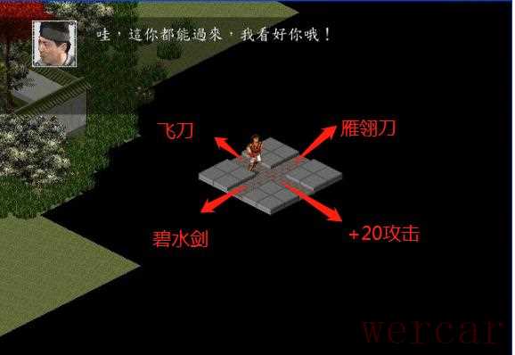 左上角:飞刀,左下角:碧水剑,右上角:雁翎刀,右下:武力增加20碧水剑和雁翎刀不值钱,游戏中500两银子随意买,飞刀家里可以拿到10把,够用。推荐右下 加攻击20点