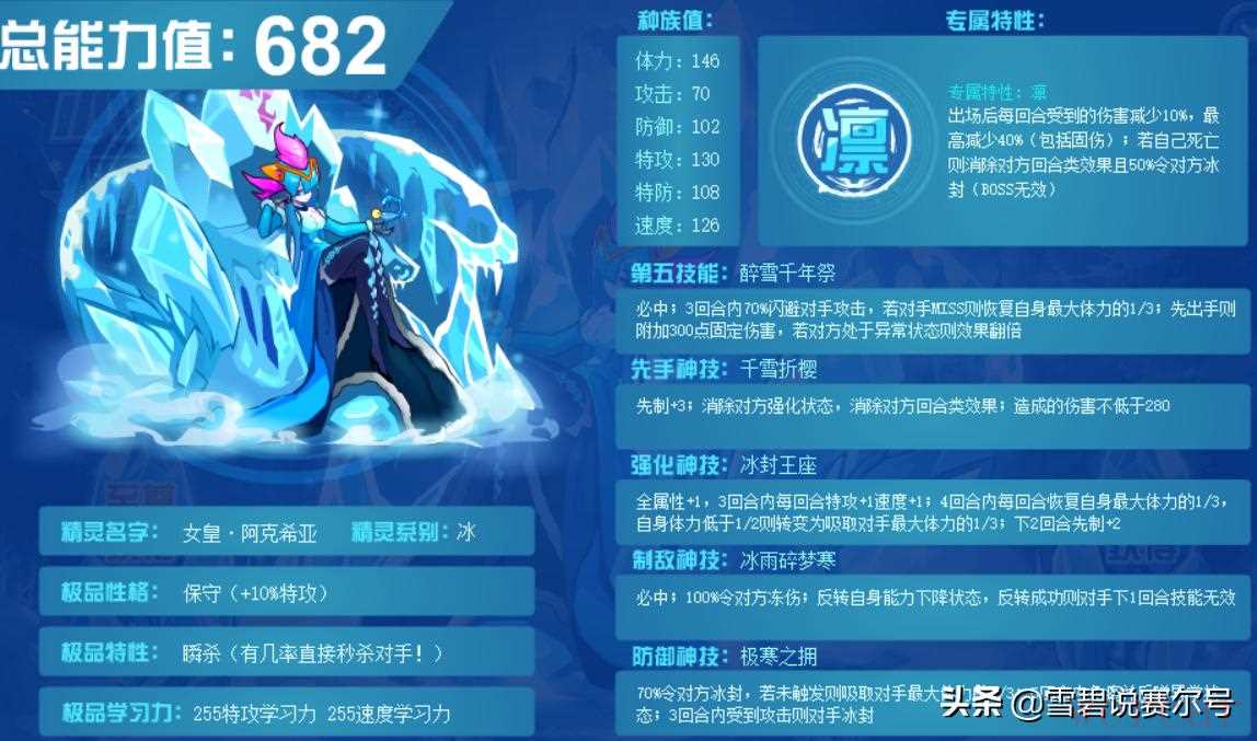 而技能组上,一口气加入了6个技能,包括极度冰点这个经典老技能都强化了一波加入进来,虽然依旧是命中率差,而且没打中就自爆,但是自爆后清PP配合魂印断回合可以达到伪佛的能力,但是没给阿克任何输出的能力,技能组核心也在于控场能力,当时基本都是用碟子加女王秒人完。冰之契约·阿克希亚——2018年属于近两年进阶的精灵了,在秩序之战达到高潮期进阶,当时扫荡进攻帕诺星系,在这个危机时刻阿克才最终进阶为完全体,这次进阶阿克直接一波到730,由于是18年进阶的,因此比战联圣化的种族值还要高一个段,但是事实也是属性过差还不改属性导致阿克进化以来就是冷门。